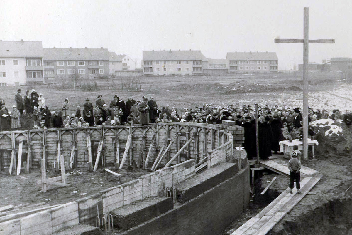 Am 12. Dezember 1959 erfolgte die Grundsteinlegung durch Dekan Otto Dietz mit den Worten „Christentum ist nicht nur eine innerliche Angelegenheit, es müssen auch äußere Räume dafür vorhanden sein.“ Der Grundstein fand seinen Platz im Altarraum. Mit ihm wurden Zeitzeugnisse, wie eine Tageszeitung, Münzen und eine Bibel eingemauert.