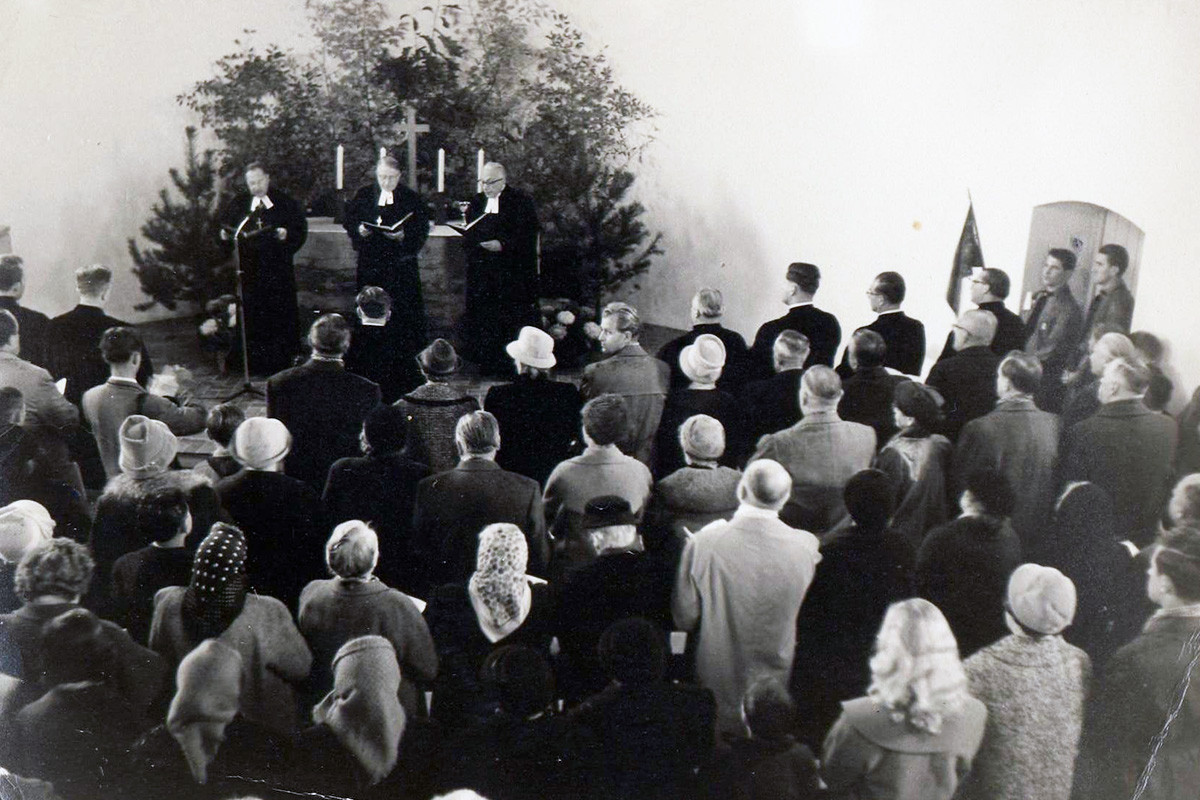 Um etwas über unsere Himmelfahrtskirche zu schreiben, muss man bis 1945 zurückgehen. Kurz vor Ende des 2. Weltkrieges kamen die ersten Flüchtlinge aus den Ostgebieten, insbesondere aus Ostpreußen, Schlesien und zum Ende des Krieges auch aus dem Sudetenland sowie den deutschen Siedlungsgebieten in Ost- und Südeuropa. Sie wurden zunächst alle auf einzelne Gemeinden verteilt. Denn Wohnraum für alle musste erst geschaffen werden. Mit dem wachsenden Wohnraumbedarf wuchs auch die Sehnsucht nach einer kirchlichen Heimat, denn unter den Aussiedlern und Heimatvertriebenen waren viele evangelische Christen.